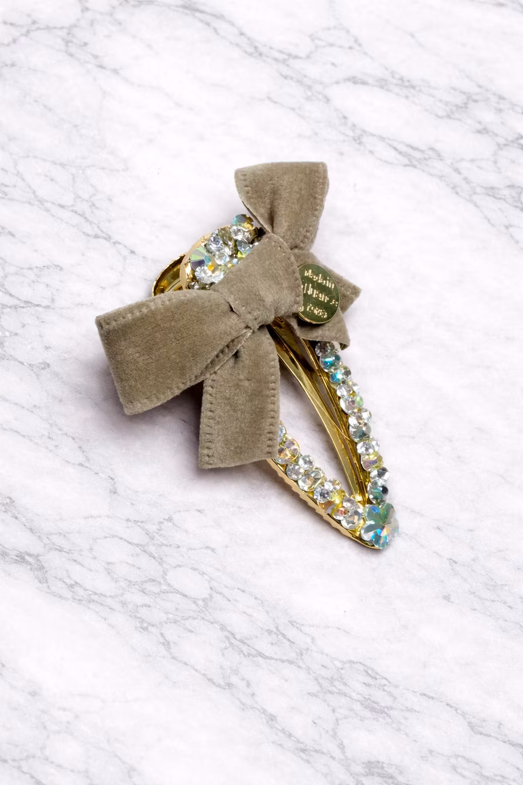 Denne eksklusive hårspennen er rikt dekorert med store, glitrende krystaller som reflekterer lyset og gir et luksuriøst uttrykk. Den delikate beige-brune sløyfen tilfører en myk og feminin kontrast, mens den elegante metalltaggen gir et gjennomført, premium preg.