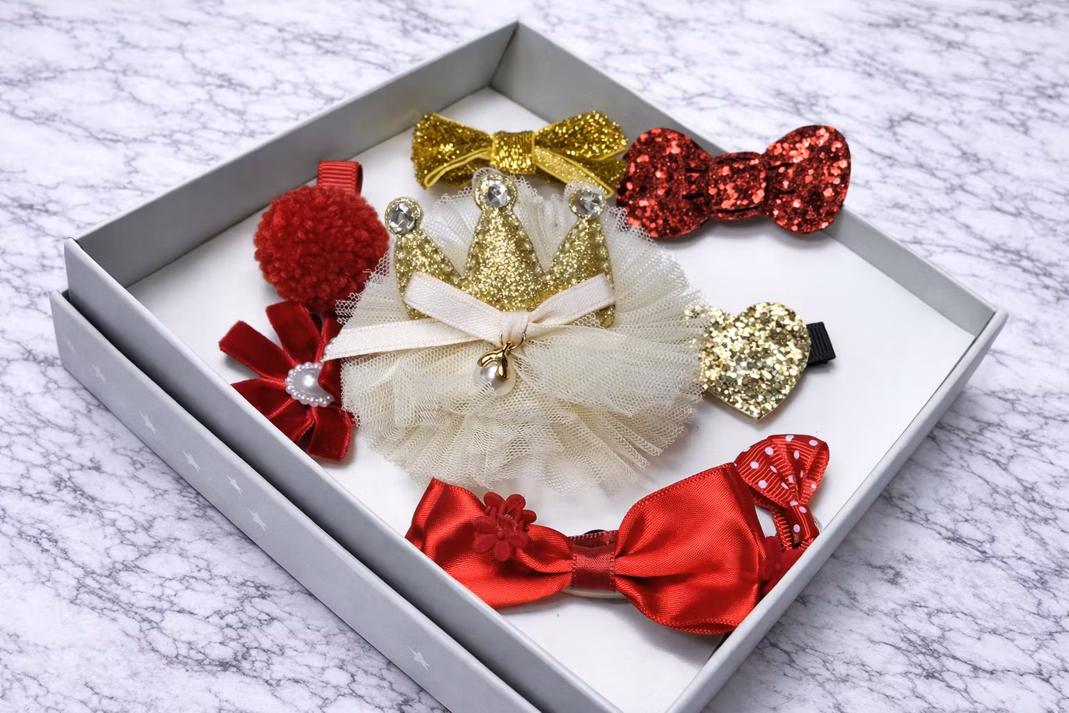Dette søte settet består av 8 hårklemmer og 2 små hårclips, designet i en vakker kombinasjon av rødt og gull som gir et elegant og lekent uttrykk. Perfekt til både hverdag og spesielle anledninger ✨
