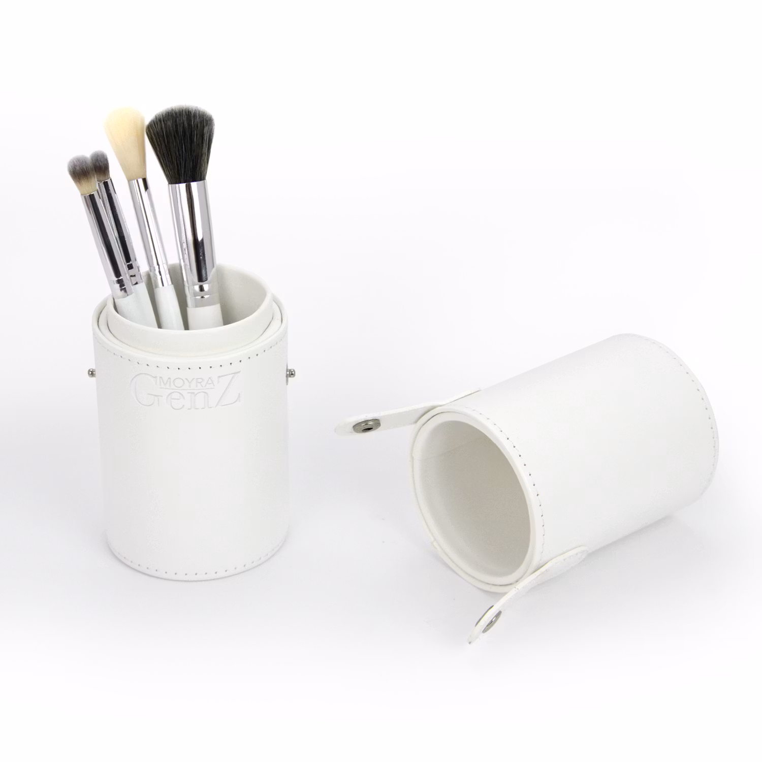 Plasser børstene i holderen og lukk den med spennene for trygg oppbevaring. Når den åpnes, kan begge sider brukes som separate børsteholdere for enkel tilgang under sminking.